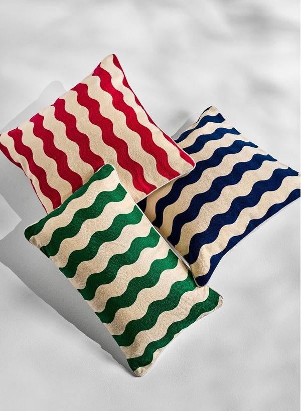 A Almofada Stripes III é confeccionada em base de algodão, formato retangular e superfície frontal bordada com lã acrílica em listras sinuosas verdes e off white. Possui verso em cor sólida branco com zíper na mesma cor. Pode ocorrer pequenas variações no desenho, nas cores e no tamanho das peças.