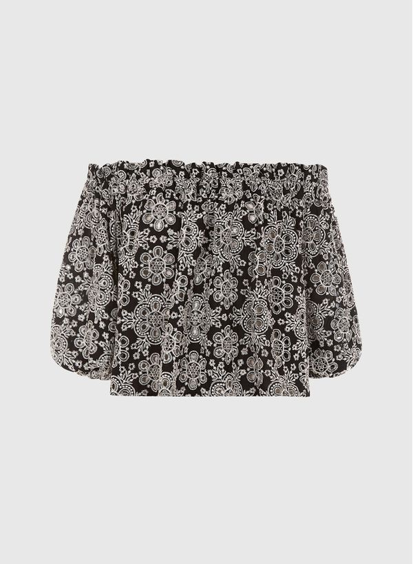 Confeccionado em tecido plano rendado, a Bata possui modelo ombro a ombro, bordados com mini recorte vazados, manga 2/4 bufantes e acabamento pespontado.