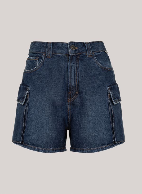 Confeccionada em jeans, a Bermuda possui modelagem cargo, cós com passantes, sete bolsos, fechamento frontal por zíper e botão, etiqueta externa aplicada e acabamento pespontado.