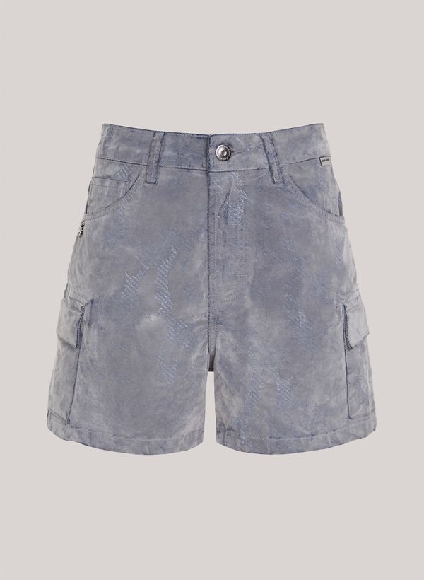 Confeccionada em jeans, a Bermuda possui modelagem evasê, cós com passantes, sete bolsos, fechamento frontal por zíper e botão, etiqueta externa aplicada e acabamento pespontado.