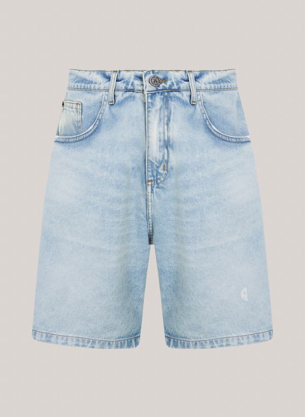 Confeccionada em jeans com lavagem clara, a Bermuda possui modelagem hype, abaixo da cintura com quadril, coxa e boca confortável, gancho desencaixado com comprimento acima do joelho, fechamento frontal por zíper e botão, cós com passantes, bolsos e acabamento pespontado.
