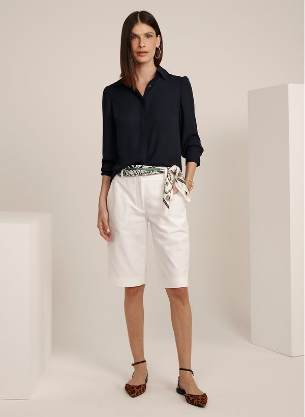 Garantindo um visual super em alta, as bermudas são essenciais para um mood elegante na produção de verão. Combine com acessórios dourados, lenço, camisas e finalize sapatilha, para um look leve e sofisticado.