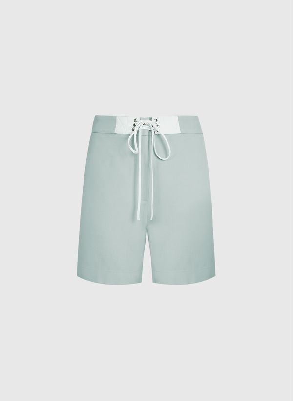Confeccionada em crepe, a Bermuda possui modelagem alfaiataria, cós aplicado com detalhe bicolor sobreposto, fechamento frontal por zíper interno e amarração, dois bolsos laterais modelo faca, dois bolsos posteriores, comprimento curto e acabamento pespontado.