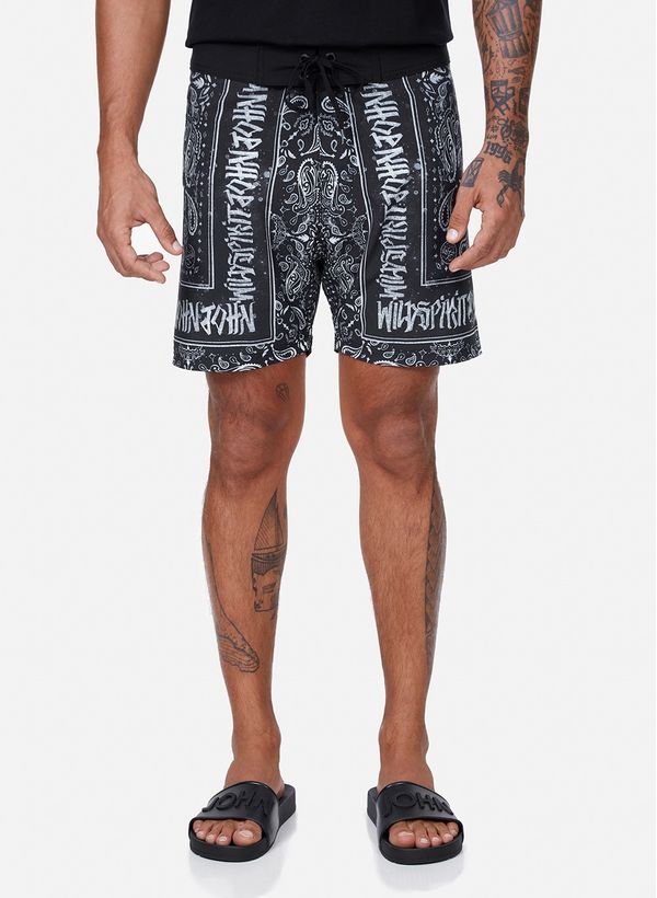 Confeccionado em tecido sintético stretch, a Bermuda possui modelagem reta, cós com cordão para fechamento frontal, estampa full e acabamento pespontado.