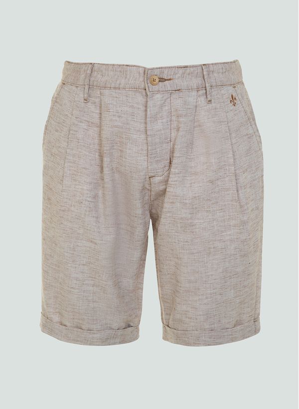 Confeccionada em Sarja, a Bermuda possui modelagem Slim Fit, cós com passante para cintos, bolsos frontais e posteriores, pregas frontais, detalhe logo bordado, fechamento por zíper e botão, barra com dobra fixa, placa com nome "Dudalina" próximo ao bolso posterior e acabamento pespontado.