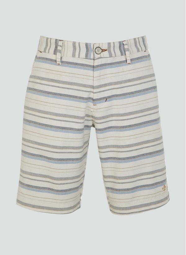 Confeccionada em sarja, a bermuda possui modelagem slim, padronagem listrada, cós com passantes, bolsos frontais no modelo faca, bolsos posteriores embutidos, fechamento por zíper e botão e acabamento pespontado.