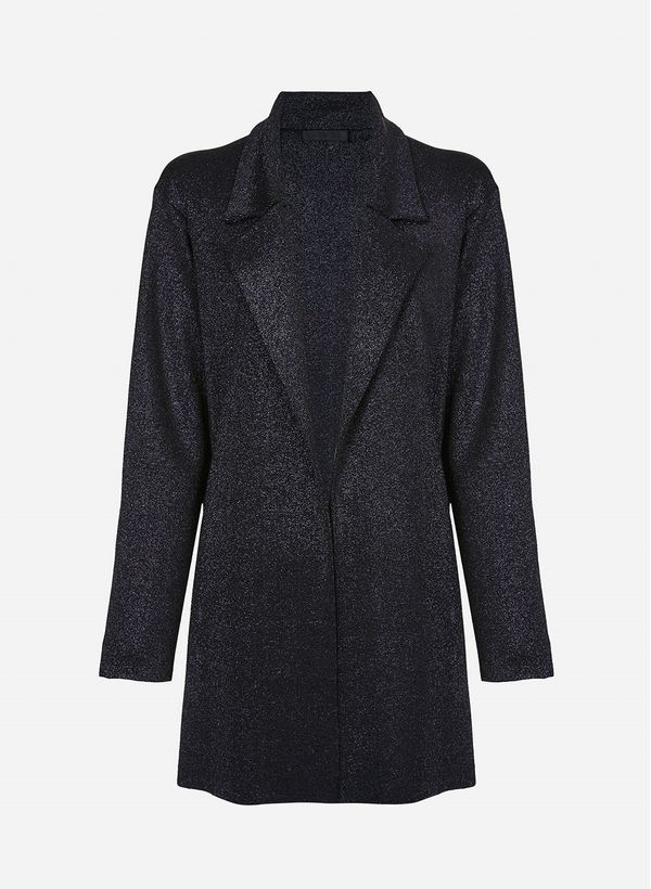 Confeccionado em tricot com lurex, o Blazer possui modelagem mais ampla ao corpo, comprimento alongado e fechamento frontal.