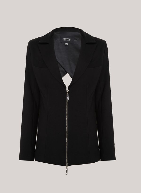 Confeccionado em tecido plano, o Blazer possui modelagem justa, decote em "V", lapelas, bolsos frontais, recorte posterior assimétrico, mangas longas, fechamento frontal por zíper com ponteiras duplas e acabamento pespontado.