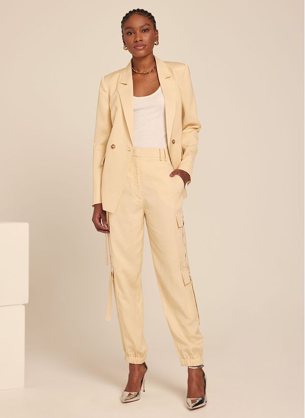 O Blazer é confeccionado em tecido plano, possui modelagem alfaiataria,caimento reto, lapelas notched, dois bolsos frontais decorativos, mangas longas com abotoamento triplo nos punhos, fechamento frontal por botões, forro embutido e acabamento pespontado.