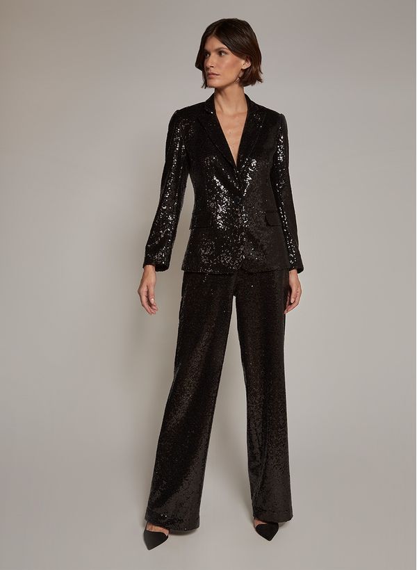 Confeccionado em tecido plano, o Blazer possui bordados de paetê, modelagem alfaiataria, caimento reto, lapelas peaked, mangas longas, bolsos frontais embutidos decorativos, fechamento frontal por botão e acabamento pespontado.