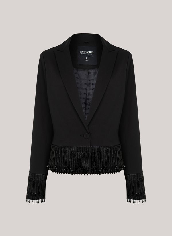 Confeccionado em tecido plano, o Blazer possui modelagem reta, decote em "V" profundo, lapela, mangas longas, franjas de miçangas aplicadas na barra nos punhos, fechamento frontal por botão e acabamento pespontado.