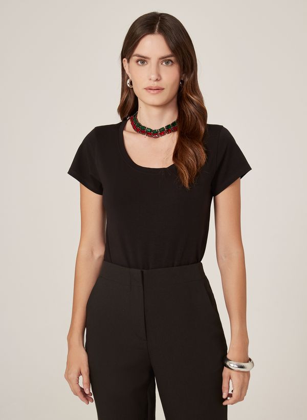 Confeccionada em malha, a Blusa possui modelagem Slim Fit, gola "U", decote careca, detalhe de logo na parte frontal e mangas curtas.