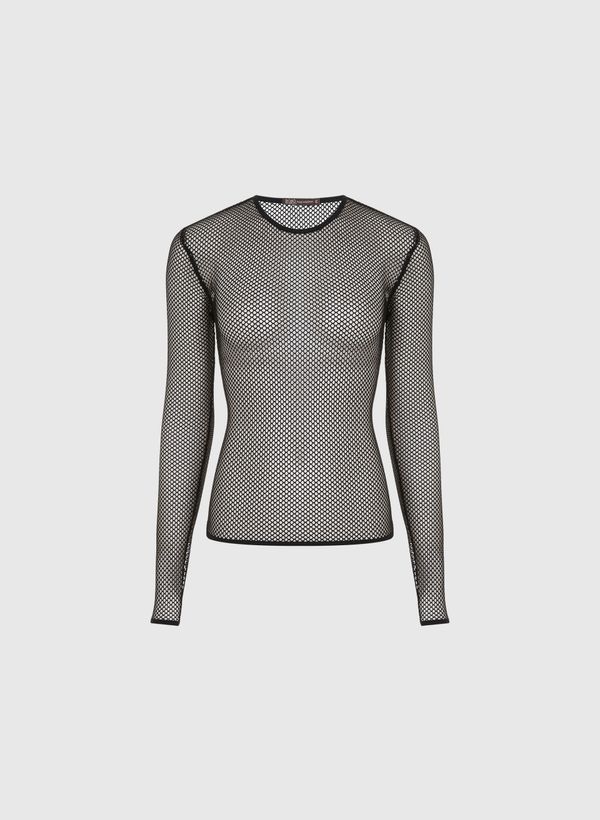 Confeccionada em malha arrastão, a Blusa possui modelagem justa ao corpo, gola redonda, transparência, mangas longas e barra reta.