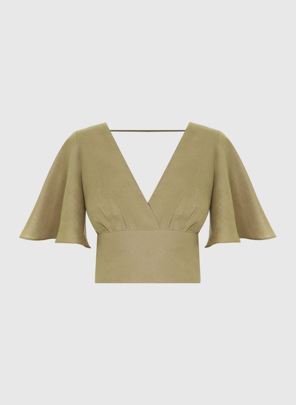 A Blusa é confeccionada em linho, possui decote em "V" transpassado com fechamento por botão de pressão, lastex posterior, mangas curtas fluídas, recorte vazado posterior, detalhes franzidos e acabamento pespontado.