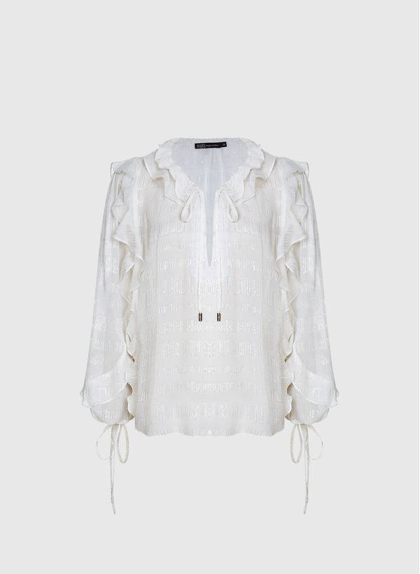 Confeccionada em seda com fios de lurex, a Blusa possui caimento reto, gola V com tiras para amarração, mangas longas com babados e amarração nos punhos e acabamento pespontado.