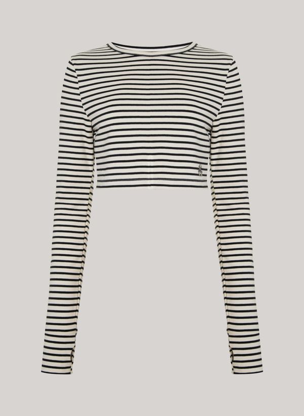 cropped, gola redonda, mangas longas, assinatura da marca em