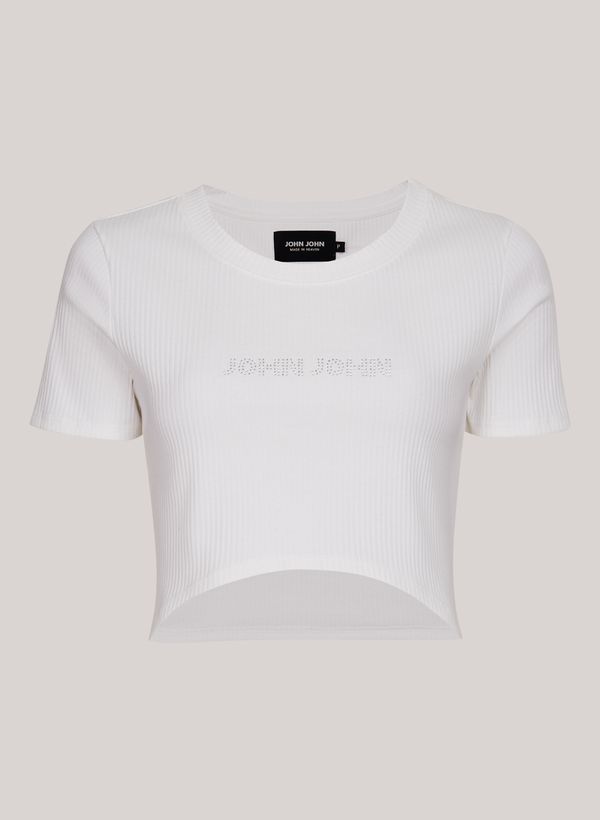 Confeccionada em malha canelada, a Blusa possui modelagem cropped, gola careca, assinatura da marca com aplicação de hot fix, mangas curtas e acabamento canelado.