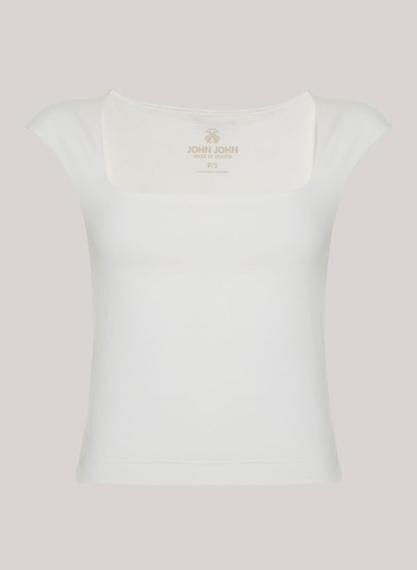 cropped, decote reto, alças largas, plaquinha metalizada personalizada e acabamento pespontado.