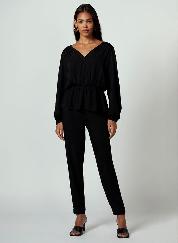 Confeccionada em tecido fluído com padronagem jacquard, a blusa possui modelagem ampla, decote V com abotoamento frontal, elástico aplicado a cintura, mangas longas e acabamento em costuras externas.