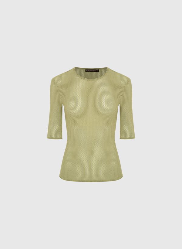 Confeccionada em tricot com detalhes vazados, a Blusa possui caimento ajustado ao corpo, gola redonda, mangas 3/4 e acabamento canelado.