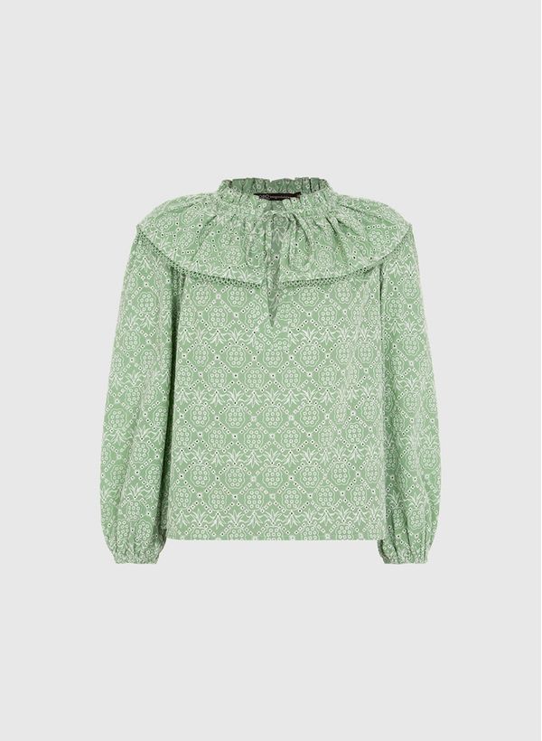 A Blusa é confeccionada em cambraia bordada, possui gola semi alta franzida com cordões para amarração, decote em gota, detalhe superior sobreposto com barra de entremeios, mini vazados, mangas 3/4 bufantes e acabamento pespontado.
