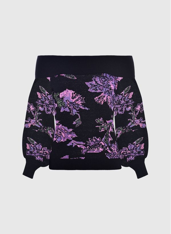 Confeccionada em tricot, a Blusa possui padronagem floral jacquard, modelo ombro a ombro, mangas longas e acabamento canelado.