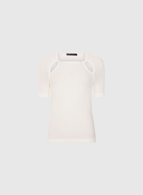 A Blusa é confeccionada em malha rib, possui gola redonda, mangas curtas, logo centralizado em silk, recorte vazado com detalhe torcido frontal e acabamento pespontado.