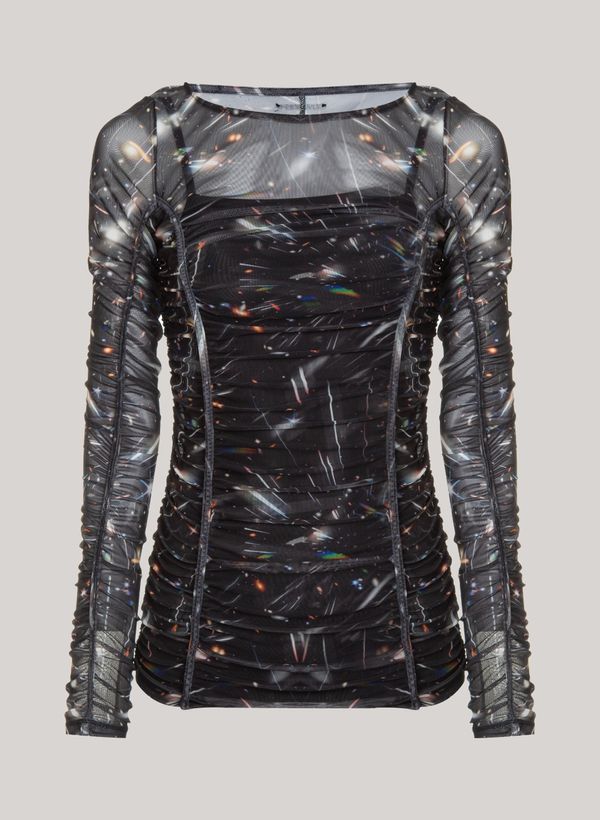 justa, decote arredondado, mangas longas, detalhes em franzidos por toda a peça, forro aplicado e acabamento pespontado.