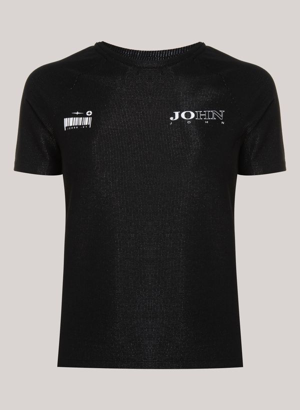 justa, gola careca, estampa frontal, mangas curtas e acabamento canelado.