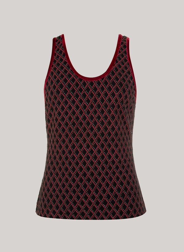 justa , decote arredondado, alças médias, decote profundo posterior, detalhes em brilho e acabamento pespontado.