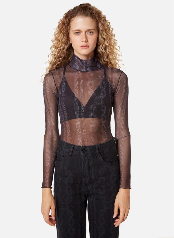 Confeccionada em tule, a Blusa possui modelagem justa ao corpo, mangas longas e gola alta. A peça possui transparência como segunda pele e estampa full print com aplicação de glitter a jato.