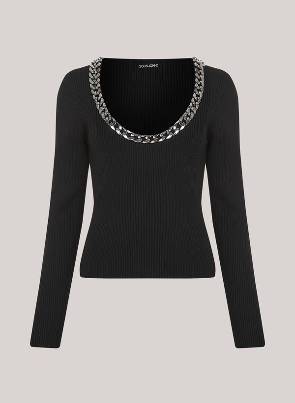 Confeccionada em tricot, a Blusa possui modelagem justa, decote arredondado com corrente aplicada, mangas longas e acabamento canelado.
