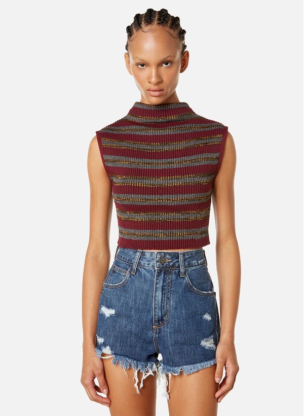 Confeccionada em tricot listrado, a Blusa possui modelagem justa ao corpo, comprimento cropped, gola tipo “careca” e sem mangas.