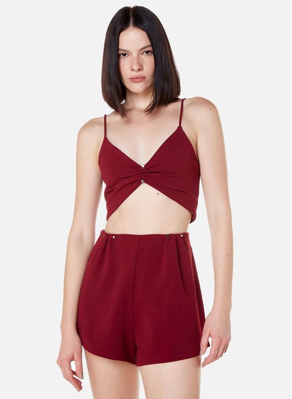 Confeccionada em tecido plano, a Blusa possui modelagem cropped, alças finas, decote em “V”, detalhe de aplicação de piercing metálico com franzido frontal e fechamento por zíper no centro costas.