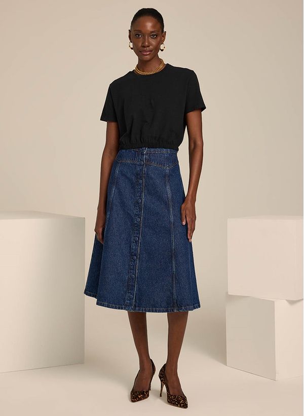 A Blusa é confeccionada em malha, possui decote redondo, mangas curtas, detalhes franzidos, comprimento cropped e acabamento pespontado.