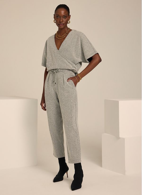 A Blusa é confeccionada em malha, possui decote V, mangas curtas e acabamento pespontado.
