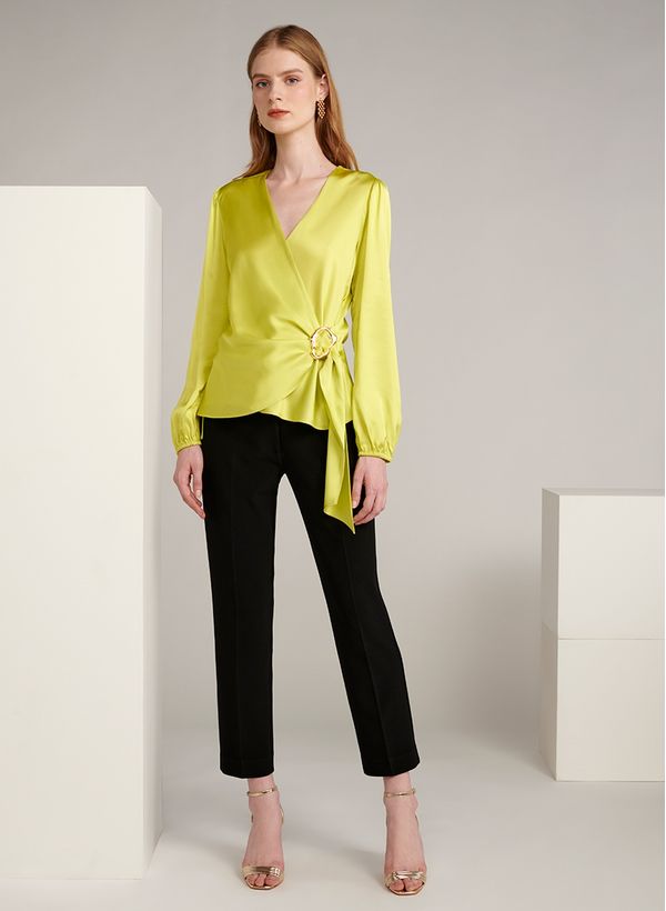 Confeccionada em cetim, a Blusa possui modelo envelope, decote V transpassado com fivela lateral metalizada, mangas longas com volume bufante e elásticos nos punhos.