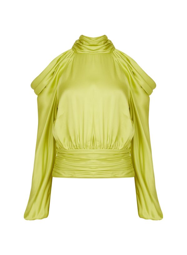A Blusa é confeccionada em tecido plano, possui gola alta, mangas longas, detalhes franzidos e acabamento pespontado.