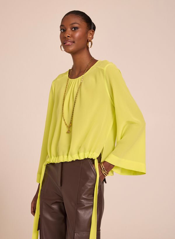 Confeccionada em seda, a Blusa possui modelagem ampla, decote arredondado com detalhes frizados, mangas longas, fendas laterais, cordão para amarração aplicado na barra e acabamento pespontado.