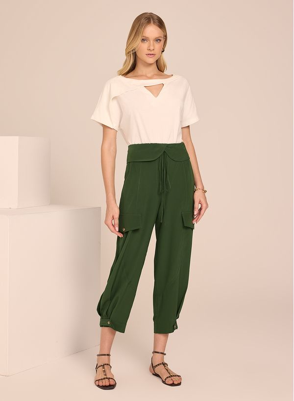 A Blusa é confeccionada em malha, possui decote redondo, recorte vazado, mangas curtas e acabamento pespontado.