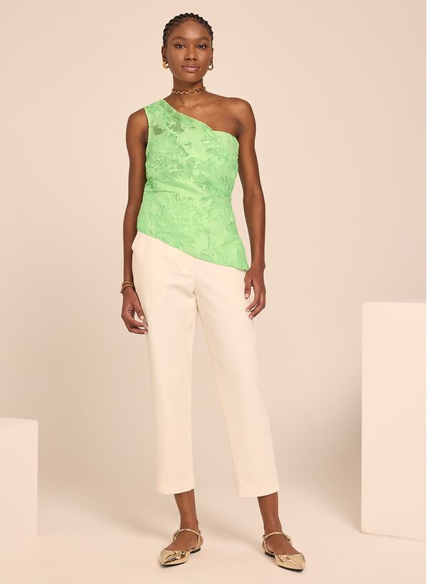 A Blusa é confeccionada em tecido plano com renda aplicada, possui decote assimétrico, alças médias e acabamento pespontado.