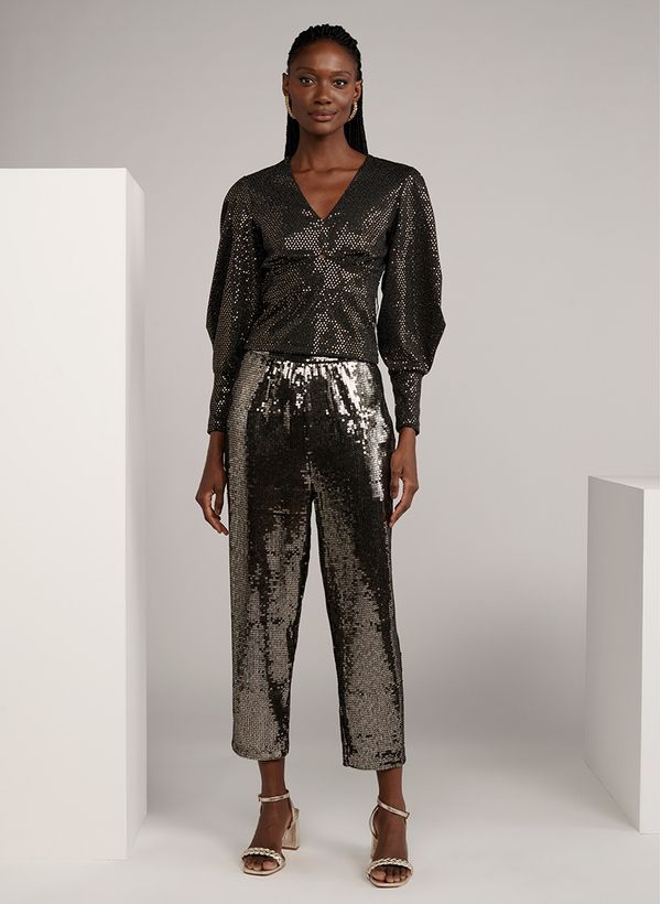 A Blusa é confeccionada em malha com efeito metalizado, possui decote V, busto com franzidos e mini recorte vazado, mangas longas com volume bufante e punhos alongados.