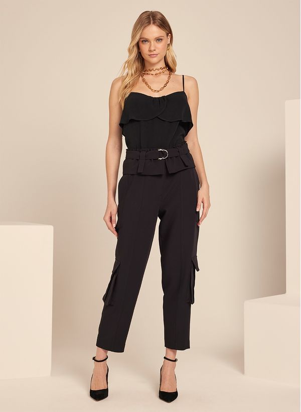 A Blusa é confeccionada em tecido fluido, possui decore reto, alças finas, babado aplicado, faixa para amarração e acabamento pespontado.