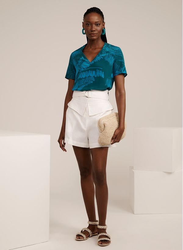 A Blusa é confeccionada em seda com estampa, possui decote V, mangas curtas, fendas laterais e acabamento pespontado.