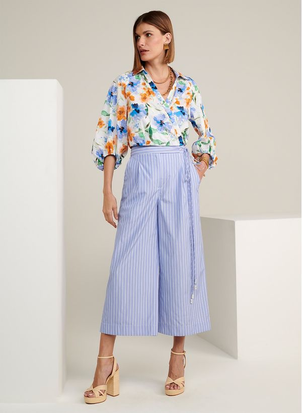 A Blusa é confeccionada em tecido plano com estampa floral, possui gola, decote V transpassado, mangas bufantes 7/8 e acabamento pespontado.
