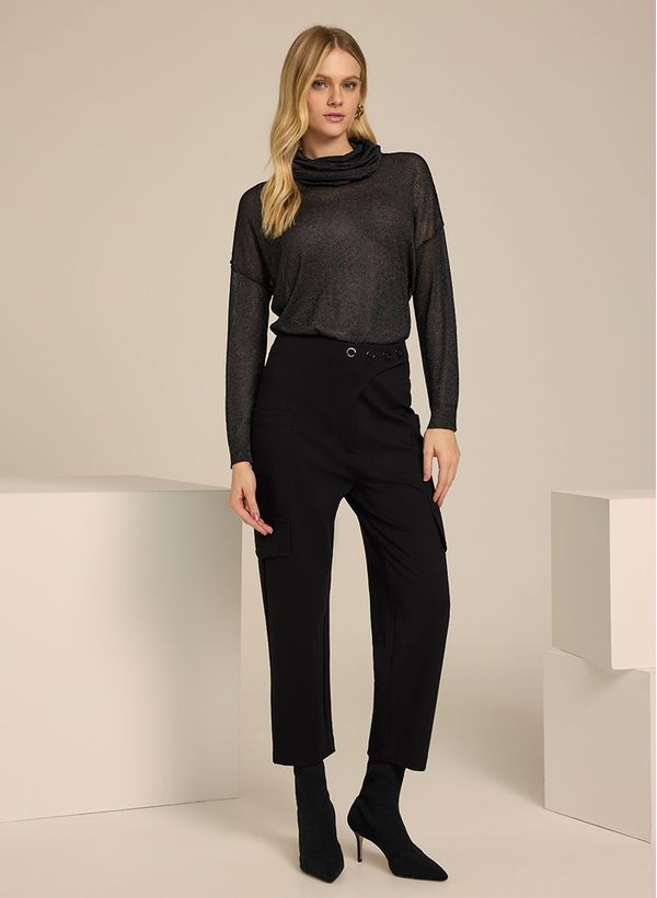 A Blusa é confeccionada em tricot, tem transparência, gola alta, mangas longas e acabamento canelado.