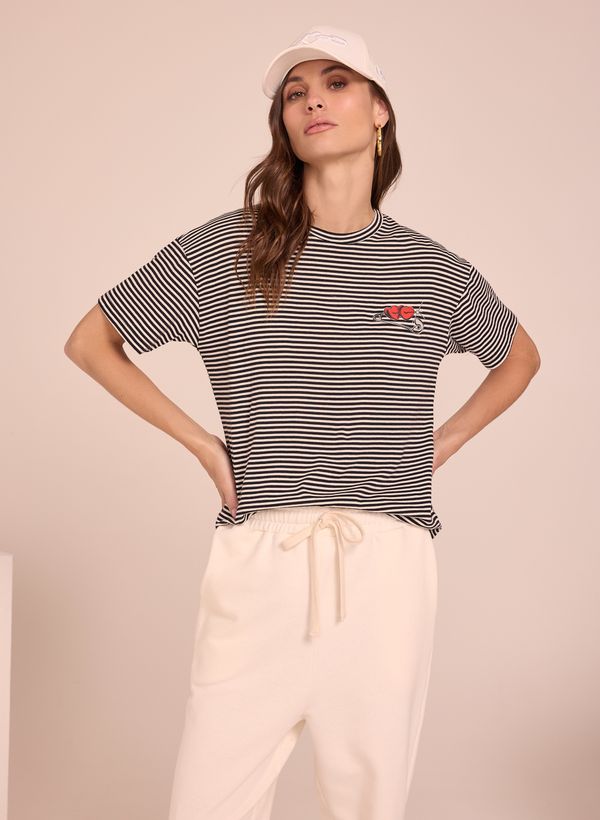 A Blusa é confeccionada em malha, possui padronagem listrada, estampa frontal localizada, gola redonda, mangas curtas e acabamento pespontado.