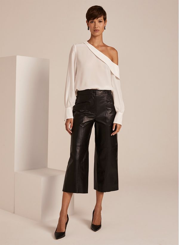 A Blusa é confeccionada em seda, possui decote um ombro só, mangas longas com abotoamento nos punhos e acabamento pespontado.