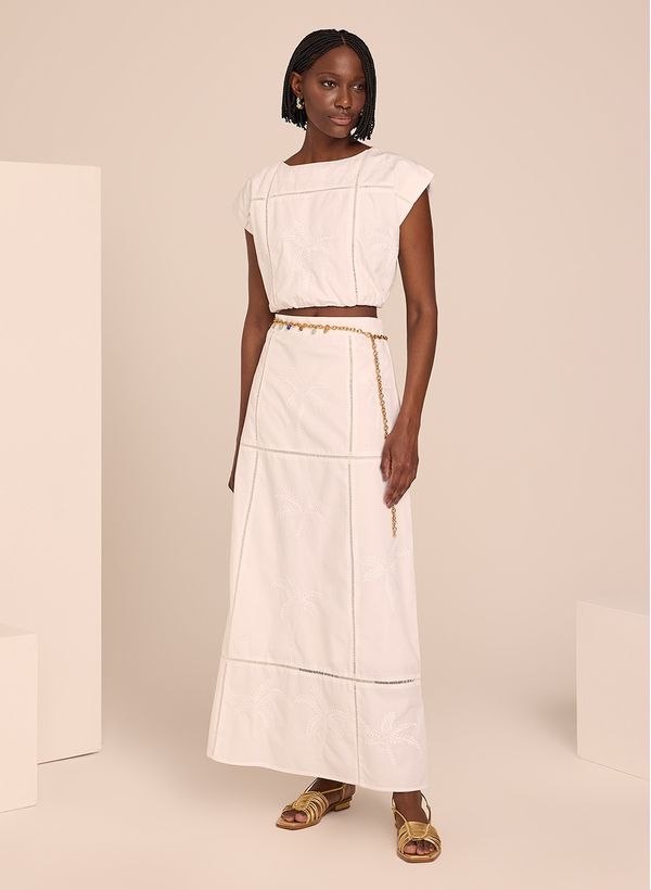 A Blusa é confeccionada em tecido plano, gola canoa, mangas curtas, detalhes de entremeios e bordados, comprimento curto com volume, barra com elástico e acabamento pespontado.