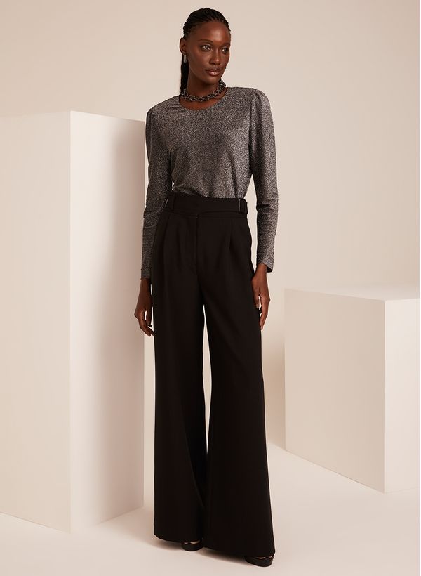A Blusa é confeccionada em malha com fios de lurex, possui caimento acinturado, gola redonda, volume nos ombros, mangas longas, fechamento posterior por zíper, detalhe de pregas e acabamento pespontado.